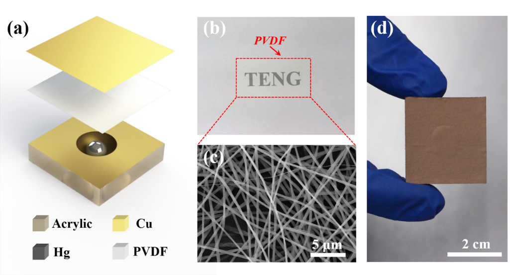 在我院杨维清教授和美国佐治亚理工学院著名科学家王中林院士共同指导下,西南交大16级博士生张彬彬和15级博士张磊,发明了一种基于液态金属摩擦纳米发电机的自驱动加速度传感器。如图1所示,该传感器主要由液态金属以及纳米纤维薄膜组成。应用聚合物纳米纤维结构可以显著提高加速度传感器的输出性能,该加速度传感器的量程达到0-60 m/s2,其灵敏度高达0.26 V•s/m2,当加速度为60 m/s2时,该加速度传感器可以产生15.5 V的电压以及300 nA的电流。使用液态金属则赋予了该加速度传感器优异的耐久性能,在连续测试200 000周期后,传感器的输出电压基本没有变化。该加速度传感器可以实时监测车辆以及一些机械装置的微弱振动,并且可以作为可穿戴设备,实现人体运动的步态分析。该加速度传感器在振动监测、分析以及可穿戴设备中具有极高的应用潜质。