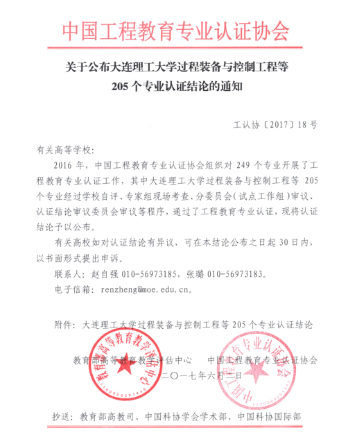 2017年6月2日,教育部高等教育教学评估中心、中国工程教育专业认证协会正式发布《关于公布大连理工大学过程装备与控制工程等205个专业认证结论的通知》(工认协[2017]18号),公布了2016年参加全国工程教育专业认证的部分专业认证结论。 2016年,中国工程教育专业认证协会组织对249个专业开展了工程教育专业认证工作,其中大连理工大学过程装备与控制工程等205个专业经过学校自评、专家组现场考查、认证结论审议委员会审议等程序,全国高校共有205个专业通过认证,我院材料成型及控制工程专业名列其中,有效期为3年(2017.1-2019.12)。材料成型及控制工程(焊接)专业成为我院第一个通过认证的专业。