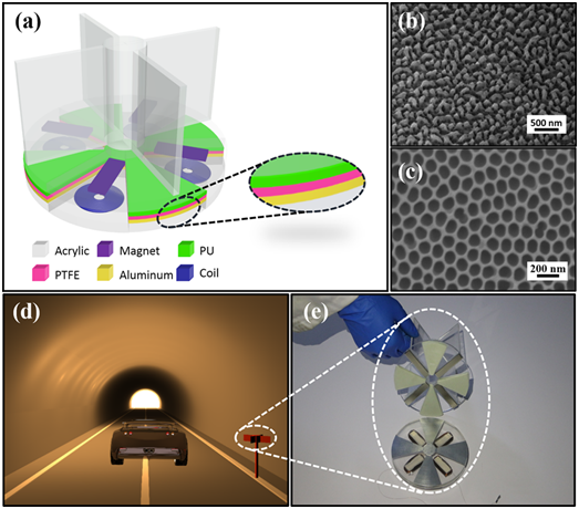 杨维清教授和美国佐治亚理工学院著名科学家王中林院士共同指导下,我校15级硕士生张彬彬和美国佐治亚理工学院陈俊博士,发明了一种无源无线车流量监测系统。如图所示,该系统杂化纳米摩擦发电机与微型电磁发电机阵列,巧妙地利用了纳米摩擦发电机的高电压和电磁发电机的强电流各自优点,应用纳米线和纳米孔的表面微结构修饰,复合纳米发电机在负载为700欧姆情况下,能够输出能量密度为55.7 W/m3,为偏远山区的隧道无源无线车流量实时监测系统提供了充足的能源,为高速列车关键部件无源无线安全监测系统的开发利用提供了新的思路和新技术。这是该团队在国际顶尖杂志Advanced Materials(影响因子17.493)和NanoEnergy(影响因子10.325)发表论文以来的又一佳作。