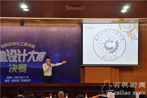 在短暂的开场视频后,8位参赛选手依次上台进行作品展示及答辩。首先上场的是1号选手汪丹妮,她设计的院徽整体色调为绿色,体现了“材料”和“环保”的基点,主体部分为不同字体的“材”和“料”组合而成的字,意在表达“新材料”和一种敢于创新的精神。第二名选手黄行达的院徽则以蓝色为主,代表了交大蓝以及材料的未来。六边形框架中内嵌着碳原子骨架,就像显微镜下做科研的感觉,体现了工程与材料的关系。面对各位老师的提问,黄行达机智幽默的回答也使得现场气氛更加轻松愉快。