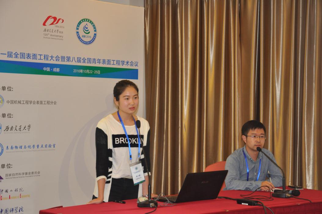 的王文健教授,南昌大学的刘莹教授,上海航天设备制造总厂的鞠鹏飞教授主持。会议时间为14:00-18:30 期间分别由黄智泉,袁成清,李娜,王伟奇,岳天洋,唐灿,刘盼盼等做会议报告。报告内容包括:《表面堆焊技术及其在工业中的应用》、《基于生物修饰的抗菌表面研究》、《搅拌摩擦焊AA2024-T3接头在不同腐蚀液中的腐蚀行为及力学性能》、《a-C:Cu薄膜中自形成纳米多层结构的制备研究》、《真空热处理温度对聚晶金刚石复合片摩擦学行为的影响》、《1Cr18Ni9Ti不锈钢在PbCl2-ZnCl2共存体系下高温腐蚀机理研究》等。