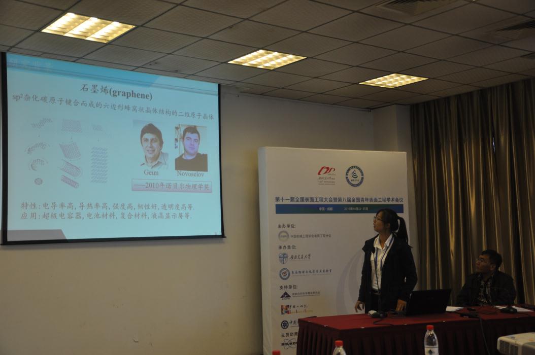 的蔡振兵教授,中国地质大学的岳文教授,北京科技大学的岩雨教授,西南石油大学的王国荣教授主持。会议时间为8:00-12:30,期间分别由Nan Huang,王晓龙,王永富,黎毓灵,郑博聪,王鑫, 薛婧泽等做会议报告。报告内容包括:《Hybrid diamond/graphite films as anodic stripping voltammetry electrodes for trace Ag+and Cu2+detection》、《表面功能化3D打印》、《碳纳米结构薄膜的直流CVD制备及超低摩擦机理研究》、《Effects of arc Plasma Assisted Nitriding Nitrogen-hydrogen flow ratio on microstructure of H13 steel》、《高功率脉冲磁控溅射等离子体输运与沉积速率模型研究》、《N掺杂对V-Al-C涂层微观结构、力学及摩擦学性能的影响》等。