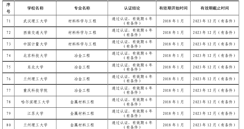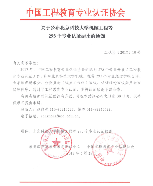 2018528日,教育部高等教育教学评估中心、中国工程教育专业认证协会正式发布《关于公布北京科技大学机械工程等293个专业认证结论的通知》(工认协[2018]10号),公布了2017年参加全国工程教育专业认证的部分专业认证结论。2017年,中国工程教育专业认证协会组织对375个专业开展了工程教育专业认证工作,其中我院材料科学与工程专业(金属与无机非金属方向)293个专业经过学校自评、专家组现场考查、分委员会(试点工作组)审议、认证结论审议委员会审议等程序,通过了工程教育专业认证,有效期为6年(2018.1-2023.12)。通过专业认证,标志着我们专业的质量实现了国际实质等效,进入全球工程教育的第一方阵