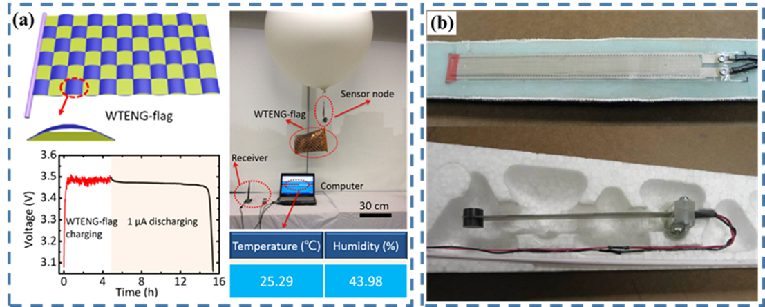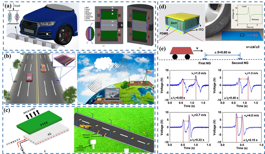 在人类历史上,交通使人类认识世界,促进文化交流,为人类文明发挥着不可或缺的作用。而得益于交通的发展,人类在实际道路与文明道路上都可以走得更远。在现代生活中,尤其是在城市交通网络,智能交通系统(ITS)的出现为了人类的安全和方便提供了更好的保障。传感器作为智能交通系统的基础,广泛用于信号采集。而在整个系统中,只有传感器工作,大数据以及后续处理才能对运输调度起作用,才可以称之为智能化。由于微电子技术的发展,小的传感器具有更低的能源消耗。但是用于传感器的电源(如电池)储存的电能仍然是有限的。并且频繁地替换或重新为电池充电对于数量巨大的分布式传感器是一个巨大的工程。与此同时,废旧电池还会给环境带来很大的影响。而另一方面,传统的电缆电源由于传感器数量的增加,出现了越来越复杂的布线问题。在这方面,自供电技术便显得尤为重要。幸运的是,纳米发电机不仅可以在交通载体运行过程中获取环境能量,为其任意分布的多个传感器供电,还可以作为主动式传感器,实现对智能交通系统的自供电无线监控。
