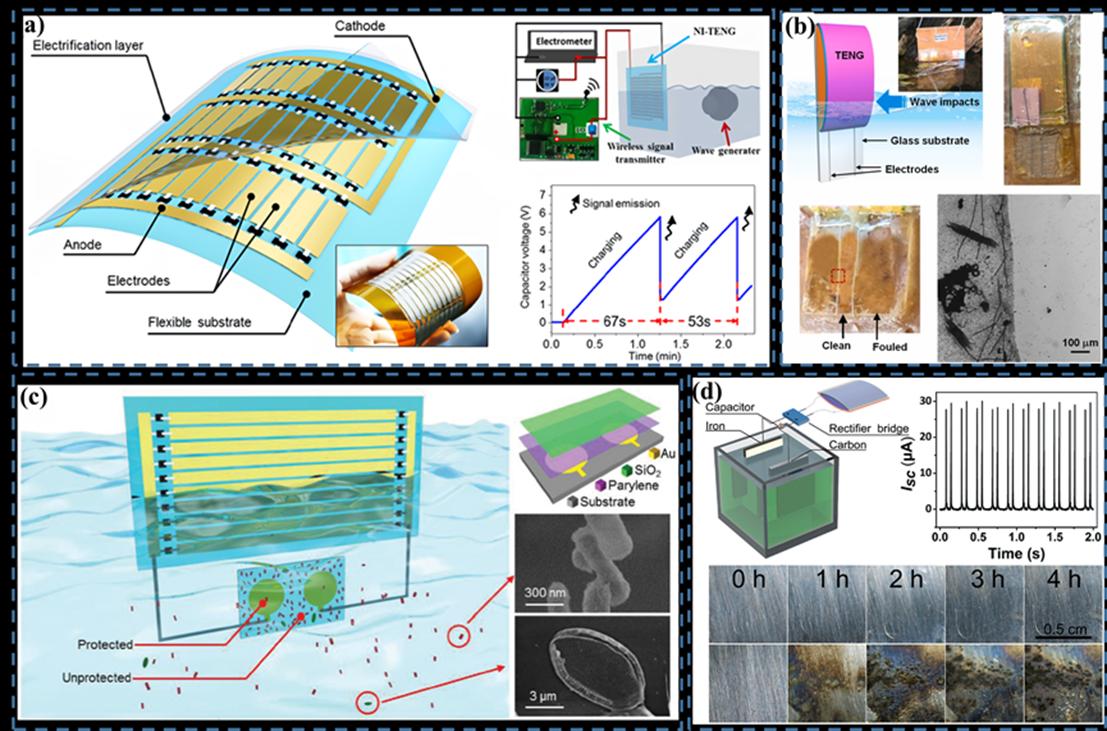 图5 摩擦纳米发电机作为能量收集技术与防腐技术在水中船舶的应用及潜在价值。