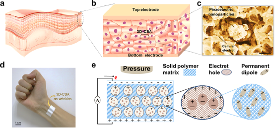 图1. 表皮启发3D-CSA的结构设计和工作原理。(a)人体表皮结构的示意图;(b)模拟表皮结构的3D-CSA示意图;(c)SEM图像展示了一个细胞传感器单元的结构,由驻极体基体和压电颗粒组成(比例尺:2μm);(d)80μm的超薄柔性3D-CSA实物照片;(e)3D-CSA的工作机理。