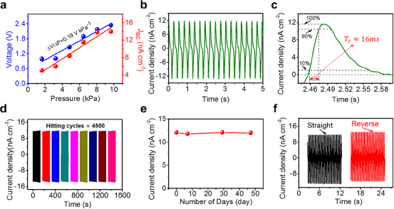 图3. 3D-CSA的电学和机械性能表征。(a)器件灵敏度的测量;(b)固定压力下3D-CSA的电流密度;(c)响应时间测量,Tr表示上升时间;(d)机械耐久性测量;(e)器件在空气中放置超过45天的电学输出;(f)3D-CSA可以从两侧独立工作。
