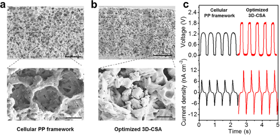 图2. 器件结构的优化。(a)多孔聚丙烯框架的截面SEM形貌;(b)包含压电纳米颗粒的优化3D-CSA截面SEM形貌;(c)CSA的电压和电流对比,黑线表示多孔聚丙烯框架的电学输出,红线表示优化3D-CSA的电学输出。