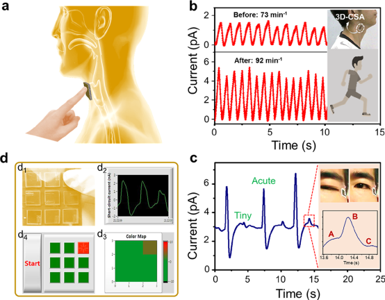 图4. 3D-CSA应用于可穿戴生物医疗检测的展示。(a)3D-CSA附着于人体皮肤上用于生物医疗检测的示意图;(b)测量心率;(c)检测眼球运动;(d)自驱动触觉成像。
