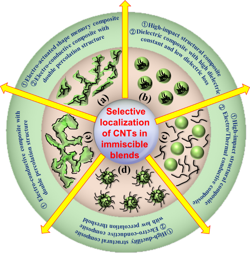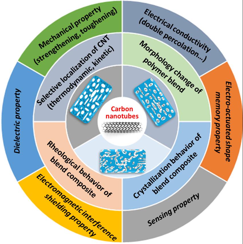 图1:碳纳米管在共混物中的选择性分布及其对共混物复合材料结构和性能的影响。