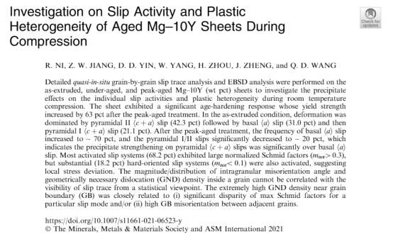 该研究从统计的角度探究了柱面析出相对各个滑移模式的相对强化效果,有助于改进析出相-位错交互作用模型,为高稀土含量及含析出相的镁合金的研究提供了新的视角,同时加深了对镁合金塑性变形行为的理解。该研究成果以“Investigation on Slip Activity and Plastic Heterogeneity of Aged Mg–10Y Sheets During Compression”为题发表在金属材料领域的高水平期刊Metallurgical and Materials Transactions A。论文合作者还包括南京理工大学周浩副教授,重庆大学郑江教授,上海交通大学王渠东教授。