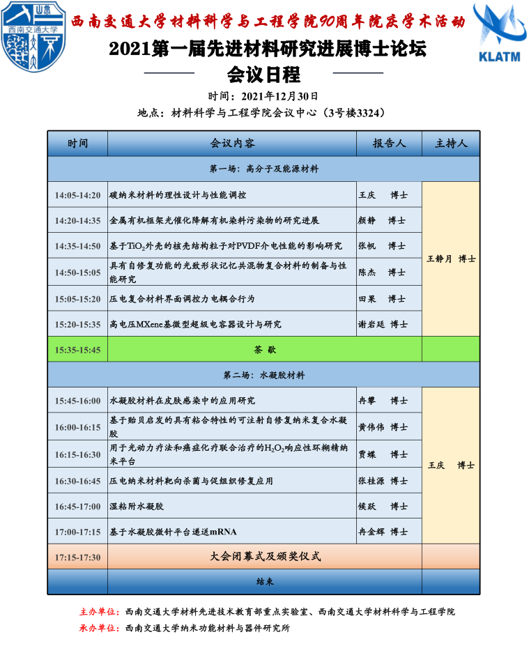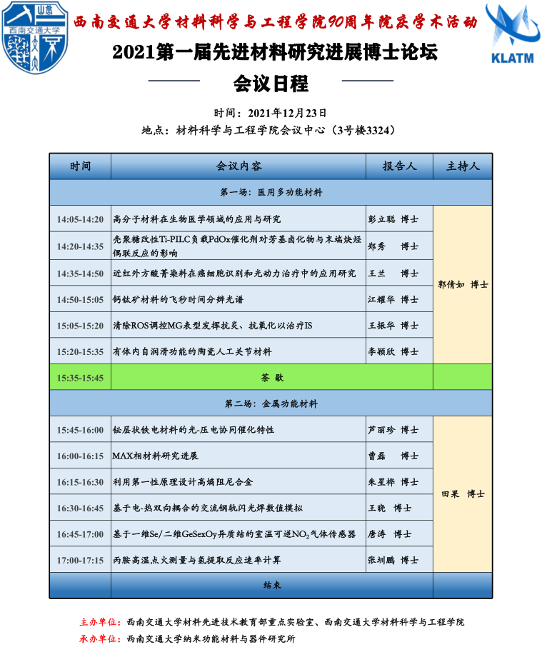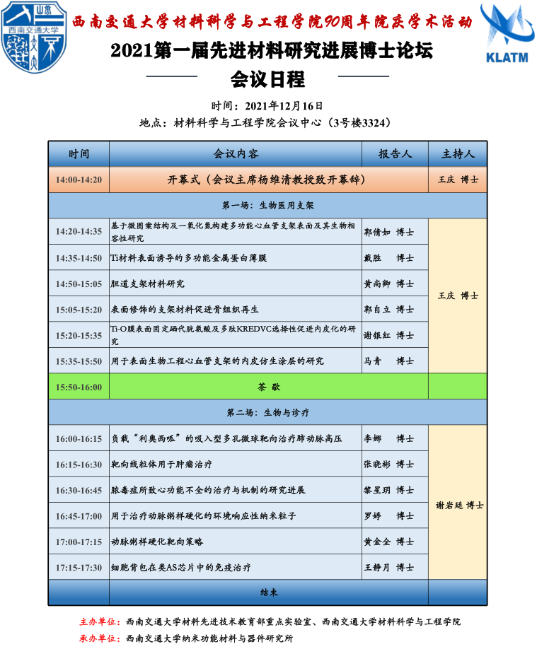 90年院庆学术活动——2021第一届先进材料研究进展博士论坛。本次论坛分为生物医用支架,生物与诊疗,医用多功能材料,金属功能材料,高分子及能源材料,水凝胶材料六个分会场,涵盖了先进材料研究前沿的36个方向,并由2021级博士进行主题报告。希望借举行此次博士论坛的契机,为今日看料
