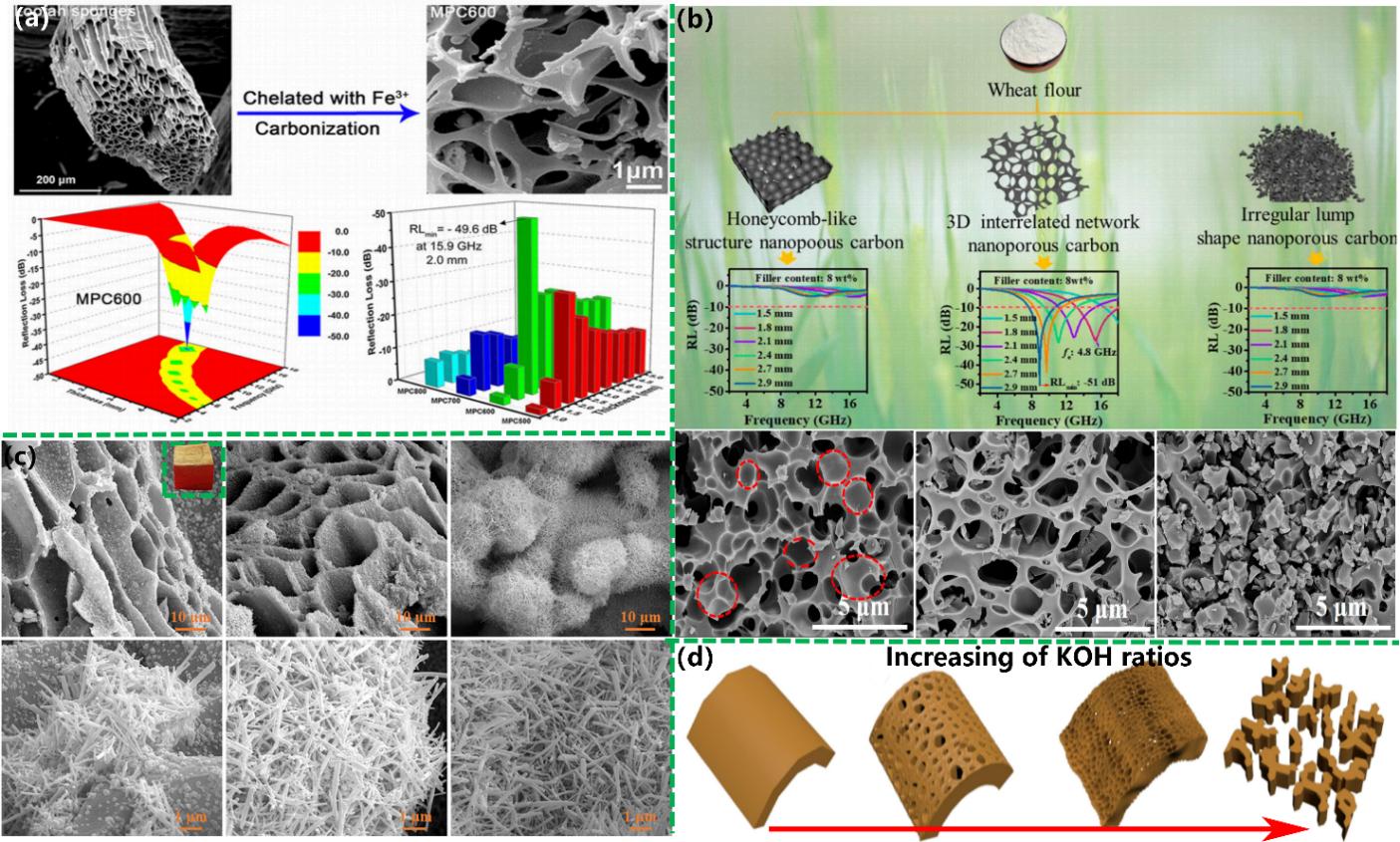 天然生物质材料有着各种各样神奇的微观形貌,这些独特的结构能够对电磁波产生一定响应行为,从而使其具有优异的微波吸收能力。其中使用最为广泛的是植物源吸波材料。植物的根茎、枝叶、果实和花朵均可作为吸波材料来源。此外,动物源材料和人类生活废物物也可作为吸波材料的来源,而微生物源吸波材料却鲜少报道。