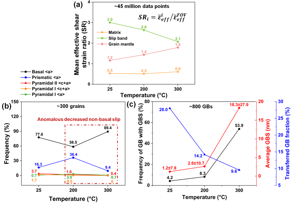 图2 晶内与晶间变形竞争的定量统计规律:(a) 基于AutoGrainDAM得到的各特定簇(基体/滑移带/晶界附近)的平均有效剪应变比(SR)随温度的定量关系,表明滑移带与晶界应变分配的竞争关系,而基体的变形最弱且温度不敏感;(b) 不同滑移模式活性随温度的变化。随着温度升高,非基面滑移的占比在200 ℃前持续增加,但在达到300 ℃后显著下降;(c) 晶界滑动及滑移传递活性随温度的变化。结果揭示了两种晶间协调机制(滑移传递与晶界滑动间的竞争关系:在25 ℃时滑移传递是主导协调机制,而300 ℃时晶界滑动转变为主导机制。需注意的是,较大的标准偏差表明不同晶界间的GBS活性存在显著差异,这是当前GBS行为的典型特征。