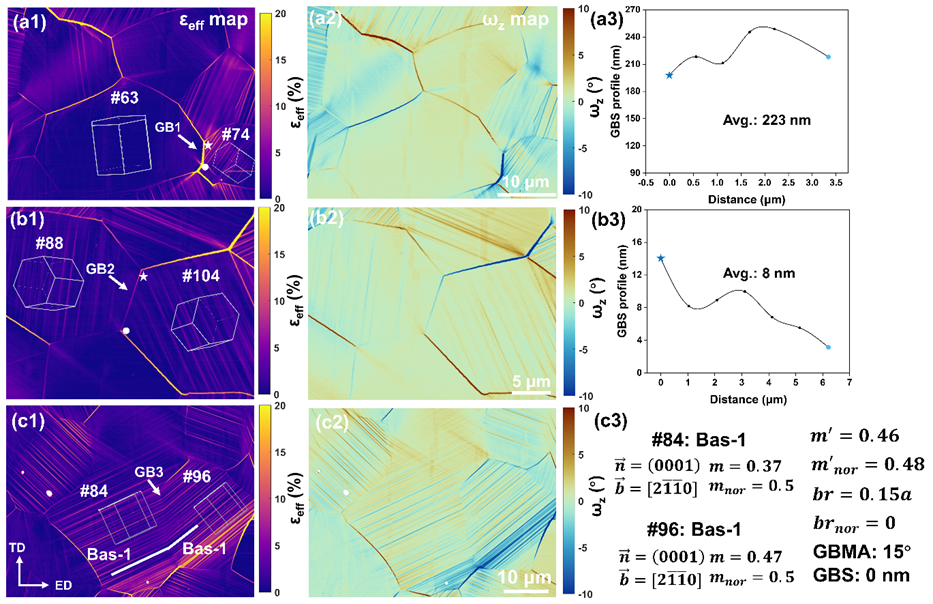 图3 晶内与晶间变形机制竞争的典型示例:(a1)-(a3) 晶界滑动主导协调变形:相邻晶粒中#74号晶粒滑移活性高,而#63号晶粒滑移活性低;(b1)-(b3) 晶粒对中大量均匀分布的滑移带主导变形协调:GBS受限;(c1)-(c3) 滑移传递主导协调变形:未检测到GBS且无晶界应变。