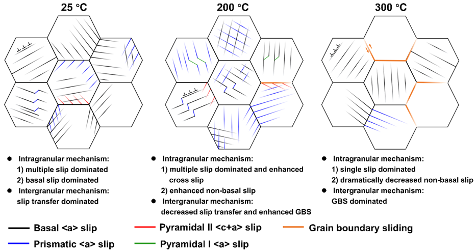 图4 各类晶内与晶间变形机制竞争的示意图:25 °C下,晶内变形由多滑移和基面滑移主导,晶间变形由滑移传递主导;200 °C下,晶内变形由多滑移主导且交滑移增多,非基面滑移增多,晶间滑移传递减少,GBS增强;300 °C下,晶内变形由单滑移主导,非基面滑移减少,晶间变形由GBS主导。
