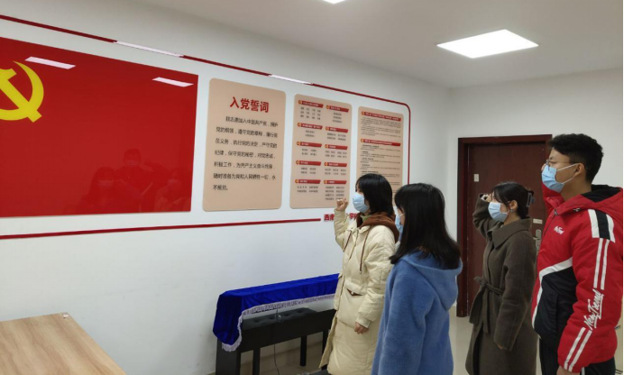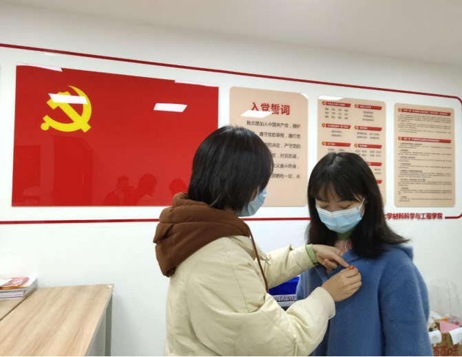 最后,支部书记梁喻嘉给邱未灵同志佩戴上党徽,与会的全体党员同志面向党旗,庄严宣誓,重温了入党誓词,时时刻刻牢记自己是一名中国共产党党员!