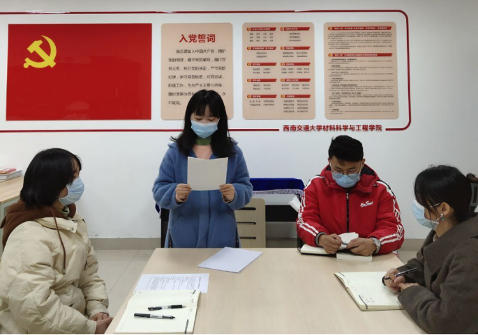 首先,在清点完毕人数后,由预备党员邱未灵同志宣读转正申请,邱未灵同志认真地总结了她预备期这一年中的思想、学习、工作、生活等方面的情况。在预备期内,邱未灵同志认真学习习近平新时代中国特色社会主义思想,积极参加党的组织生活,不断加强对党的理论知识的学习,加深对党的认知和理解,增强党性。她认真履行党员义务,努力学习,踏实工作争当模范,尤其是参加基层党建工作之后,在思想上有了重大提升,对于党建和基层学生工作有了更加深刻的认识,为了不断提高工作能力,她时刻不忘去学习,虚心去请教。最后邱未灵同志总结了自己当前还存在的一些问题,并表示将牢记中国共产党的初心和使命,更加积极认真地完成党组织的任务,努力带动支部建设。