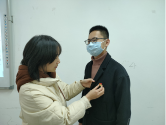 最后,支部书记梁喻嘉同志为各预备党员佩戴党徽。