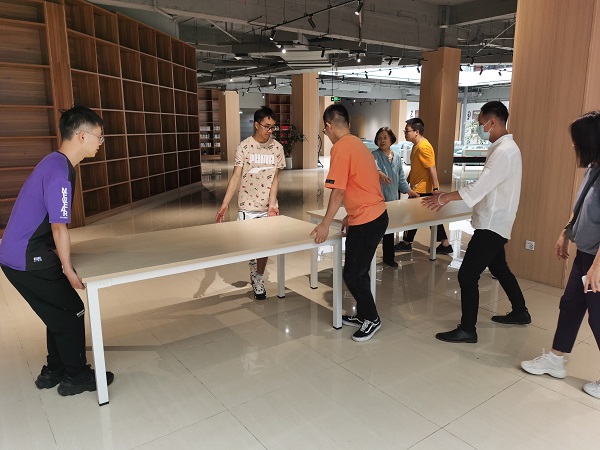 2021年5月17日,花艺展顺利闭幕,下午4时,支部成员集合于图书馆,帮助图书馆老师撤展,将桌椅及道具归还原处。