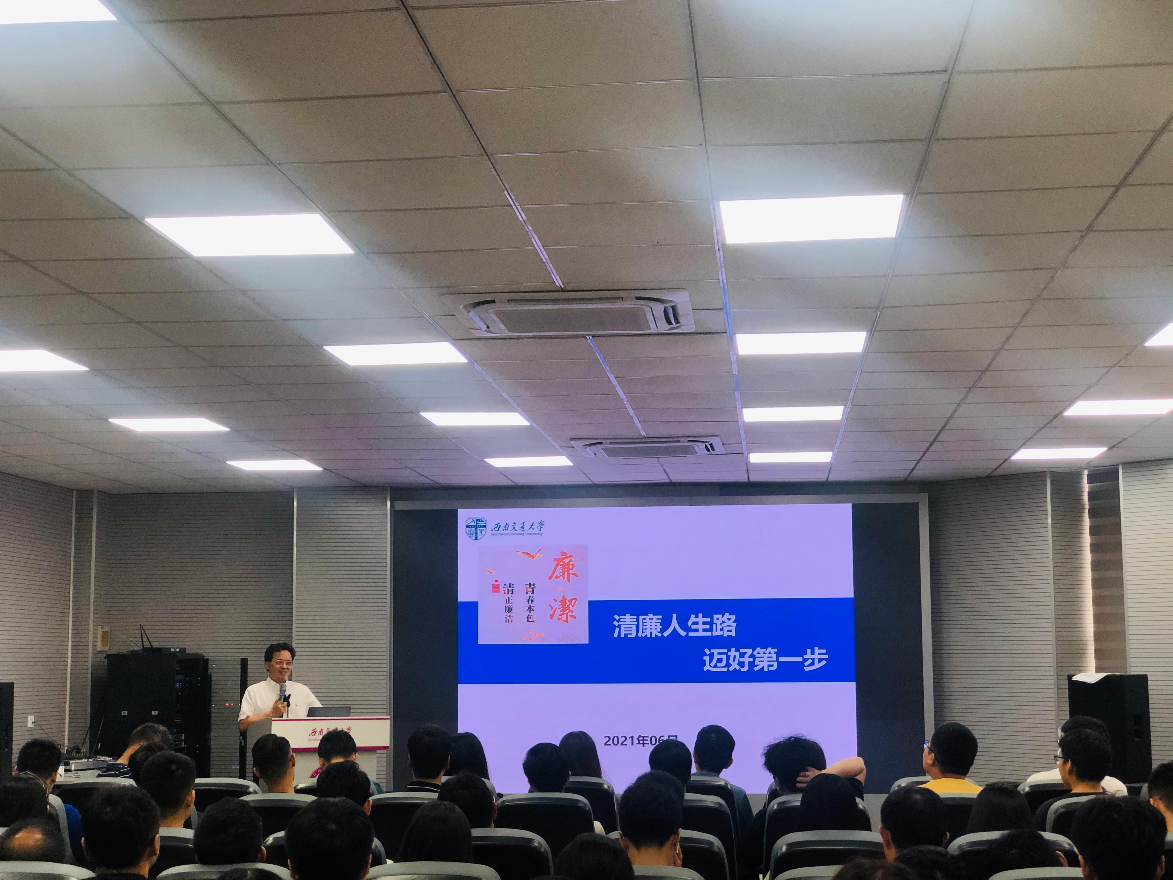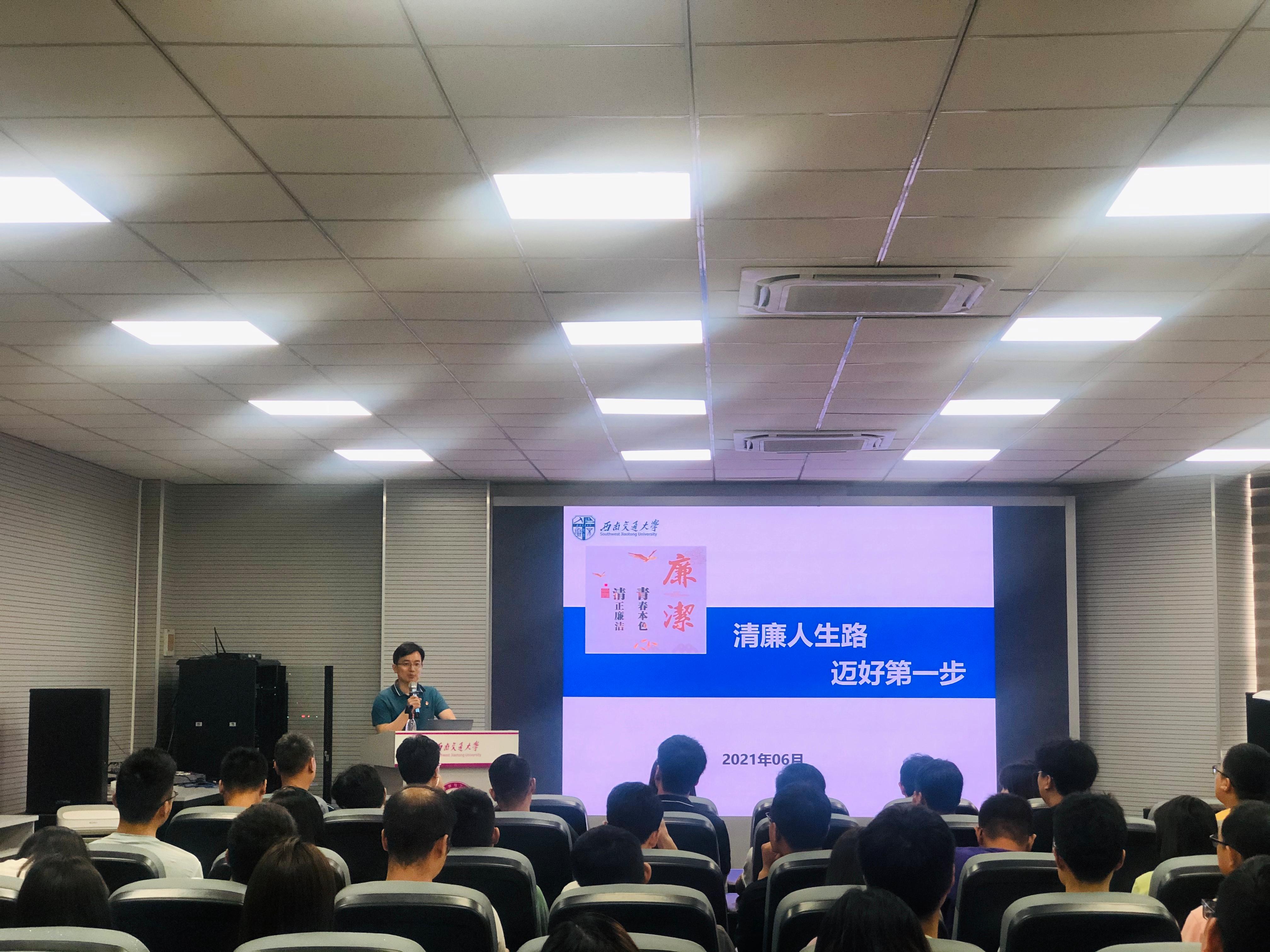 毕业年级研究生讲授党史学习教育专题党课,主题为《清廉人生路,迈好第一步》。学院2021届毕业年级在校研究生和部分低年级研究生党员、部分教职工党员和辅导员,共计200人参加党课。党课由学院党委书记陈勇主持。