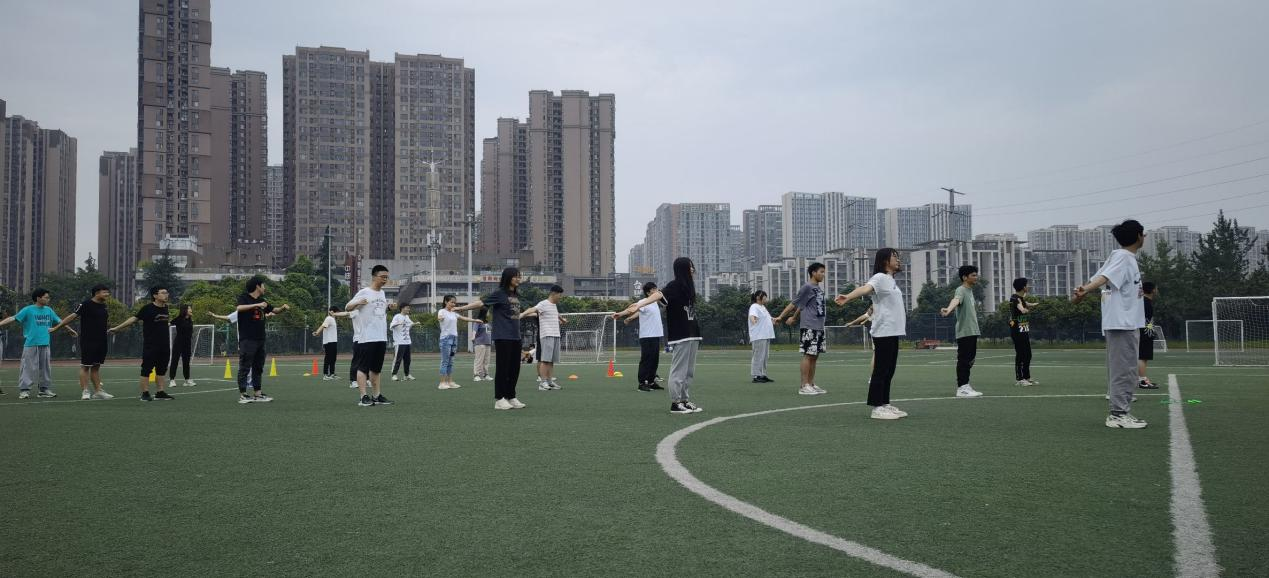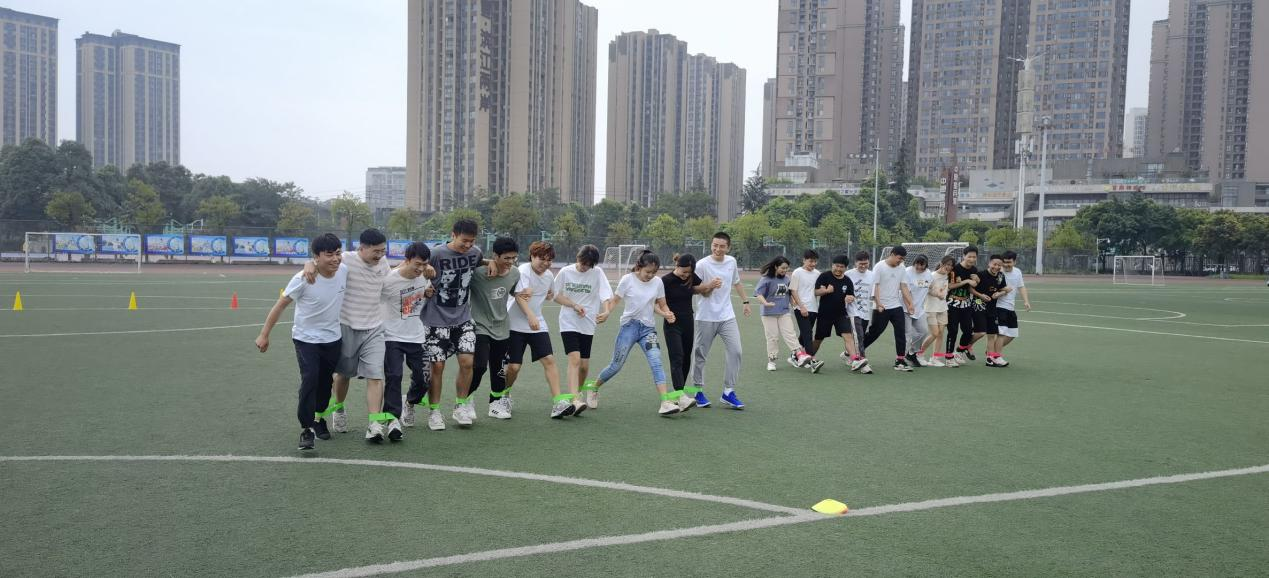 随后在任思雨、周孟雪、程莹洁的组织下进行了第一个项目——绑腿跑,每组队员将绑带绑好进行短暂练习后进行比赛,锻炼了协作能力和身体协调性。