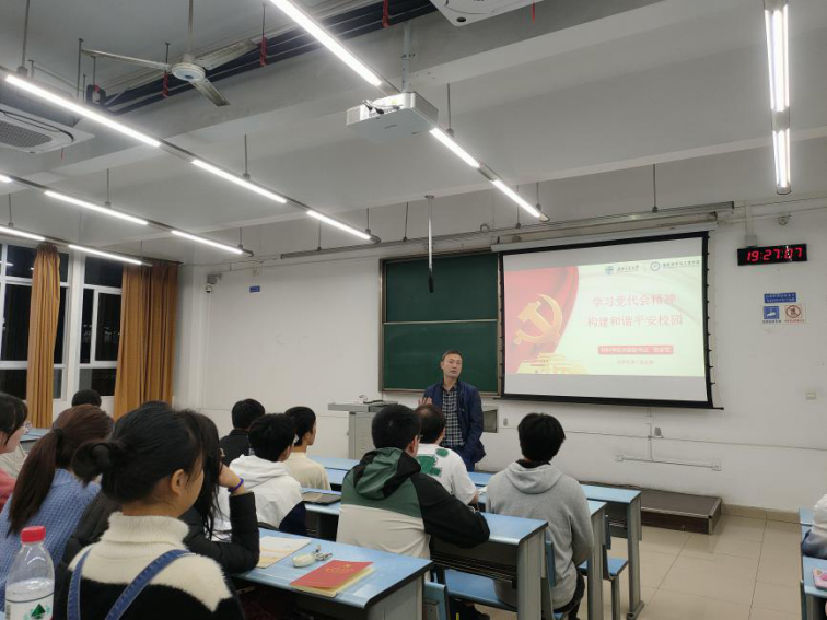学院党委副书记章春军以“学习党代会精神,构建和谐平安校园”为主题,向与会同志详细解读了学校第十五次党代会报告中关于做好校园安全稳定工作的内容,强调了安全稳定工作对于构建和谐平安校园的重要意义。他说,安全稳定是学校办学治校的重要保障,守护校园安全,特别是做好学生群体的安全稳定工作,离不开学生党员干部的全力支持和配合。