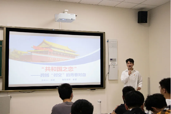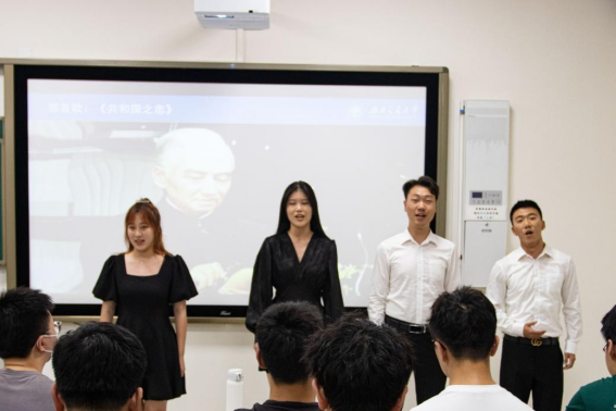 会议第二项,邀请到由马克思主义学院赵晨老师指导的“音乐里的故事”讲演团成员,为大家带来《共和国之恋——跨越时空的青春对白》,通过袁隆平、屠呦呦、华罗庚、付巧妹等前辈的事迹,深刻诠释了新时代科学家“朗朗报国志 ,巍巍中华心”的爱国之情。讲解期间,《共和国之恋》讲演团为大家带来合唱表演《共和国之恋》,拳拳爱国之心在悠扬的歌声中烙印在每一位同学的心中。