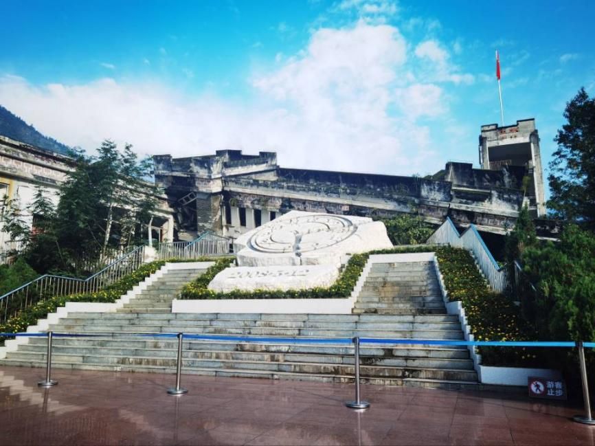 同志们首先参观了映秀漩口中学遗址。走进漩口中学遗址,第一眼看见几栋残破颓圮的楼房前那一盘白色大理石钟表雕刻,表盘上的时针停留在十四时二十八分的位置。在讲解员的解说下,同志们了解到映秀在“5.12”地震中的受灾情况和灾害发生时的感人事迹。