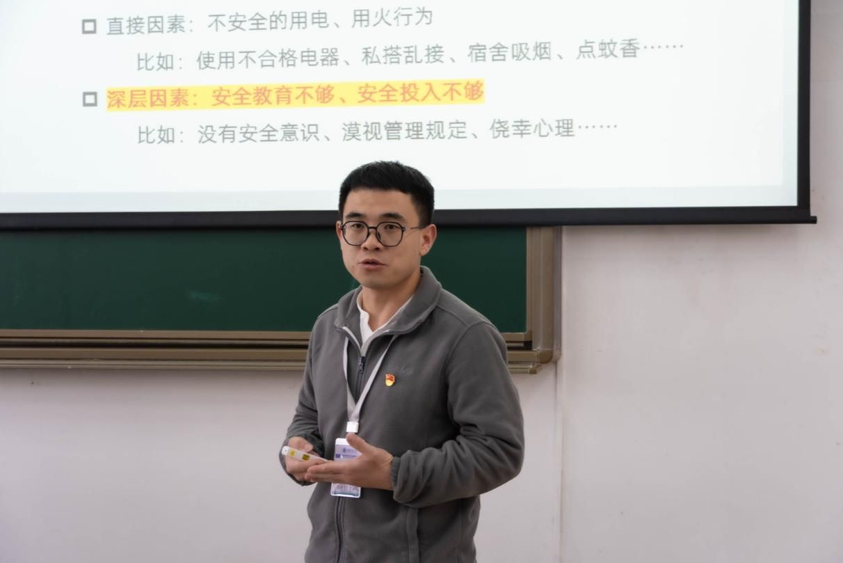 郑纪伟老师为大家进行宿舍安全教育。他讲述了宿舍消防安全的重大意义、风险因素,指出当前同学们消防安全意识不足,用电、用火行为不规范的问题较为突出,希望学生党员在宿舍消防安全工作中发挥其先锋模范作用,在具体实践中锤炼党性修养。