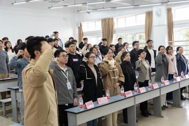 与会老师为新发展入党同志举行党徽佩戴仪式,并分组为学生党员宿舍授牌。老师们嘱托各位同志时刻牢记党员身份,做好表率,在服务师生中践行入党初心。