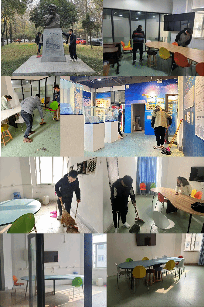 刘进同志对本次活动任务分工进行了简单说明,各小组有序开展各自负责区域的清洁服务。活动期间,同志们积极工作,认真负责,打扫了3号教学楼展厅及研讨室、擦拭陈能宽院士雕像等。他们也积极与同学们交流,向他们宣传楼层公共卫生的重要性,鼓励大家共同维护好公区卫生。