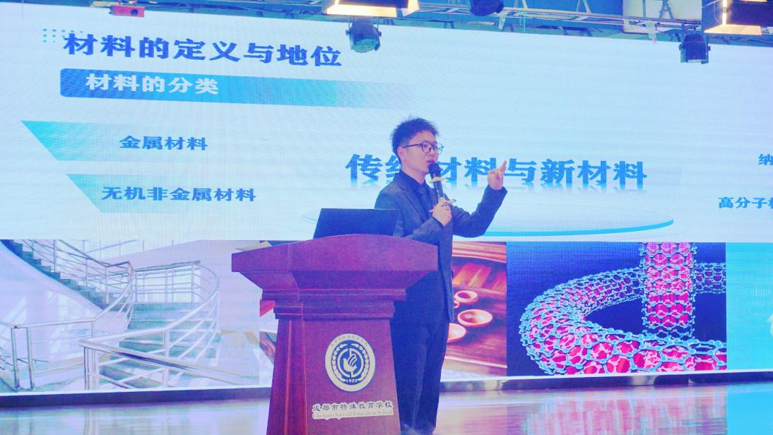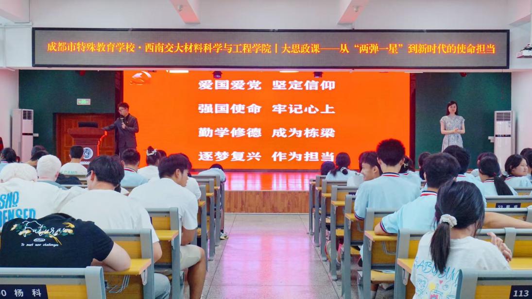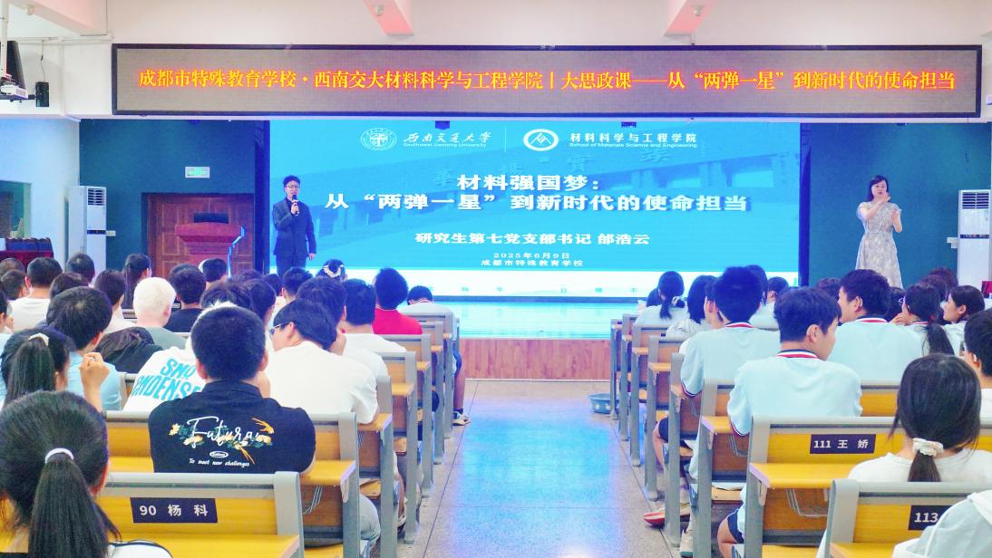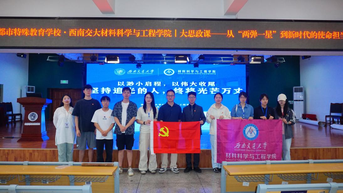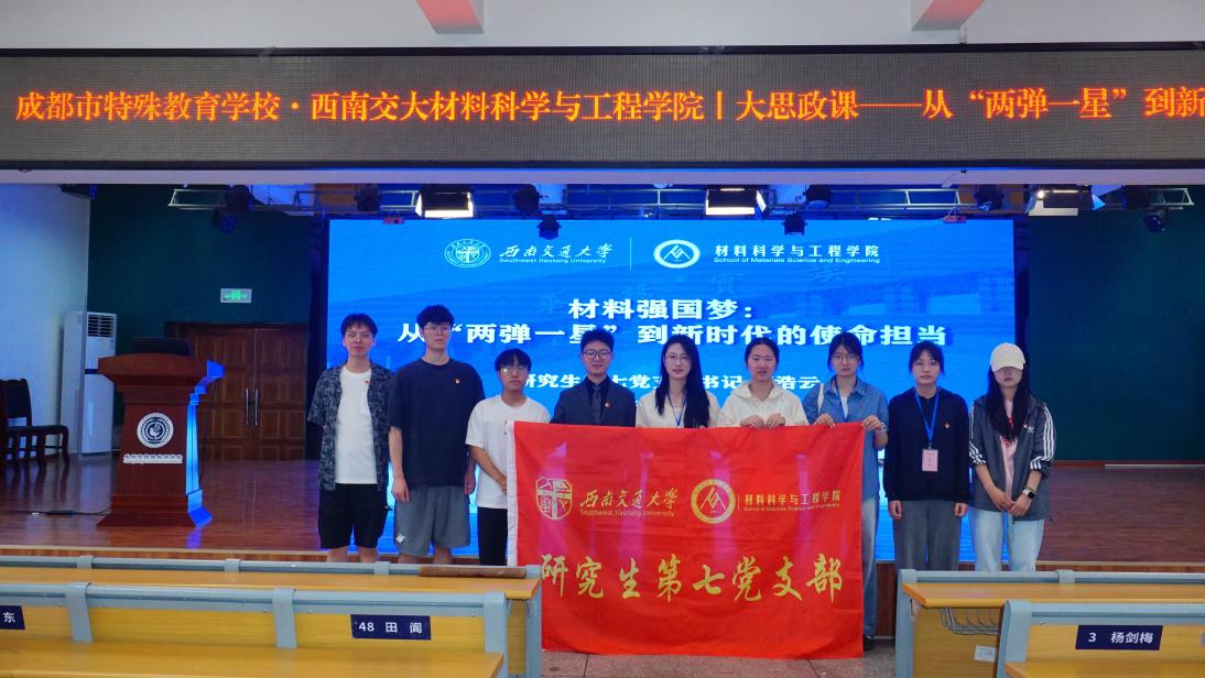 研究生第七党支部走进成都市特殊教育学校开展参观交流活动。支部邰浩云为初高中部学生讲授了一堂主题为 “材料强国梦:从‘两弹一星’到新时代的使命担当” 的材料思政课,将知识传递、精神传承与使命教育相结合,为特殊教育学生带来一场别开生面的学习体验。